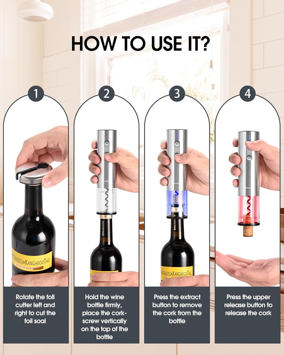 - فتاحة زجاجات النبيذ الكهربائية: فتاحة زجاجات النبيذ الكهربائية لدينا تُسهّل عملية استخراج الفلين. استخدم قاطع الرقائق المرفق لإزالة الأختام بسهولة، ثم ضع الفتاحة فوق زجاجتك واضغط على زر. في ثوانٍ، يكون نبيذك مفتوحًا وجاهزًا للتقديم. تأتي فتاحة زجاجات النبيذ لدينا مع كابل شحن USB لسهولة إعادة الشحن، وبشحنة كاملة، يمكنها فتح ما يصل إلى 60 زجاجة نبيذ. ودّع مفكات الفلين اليدوية واستمتع بفتح زجاجات النبيذ بسهولة.