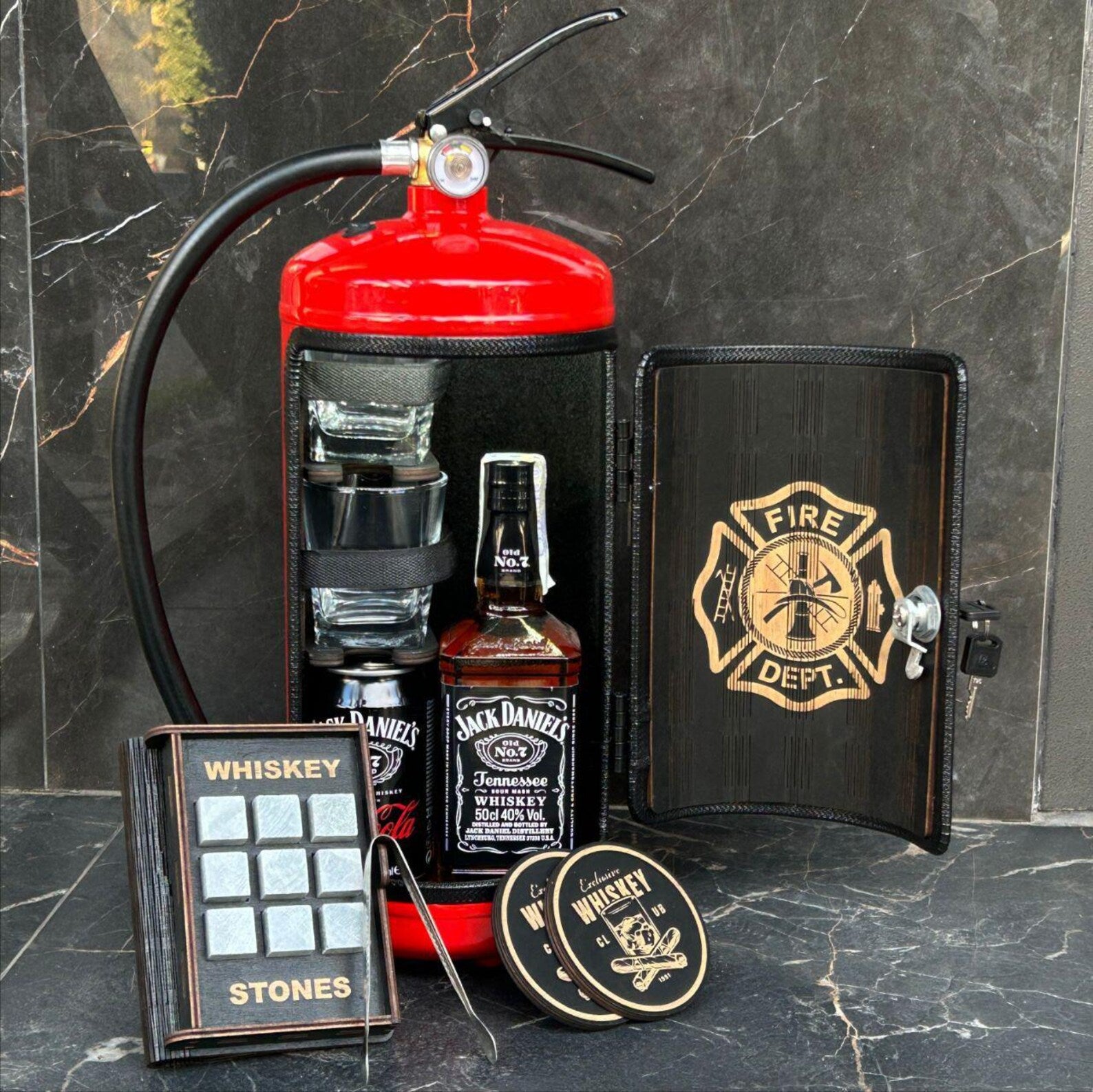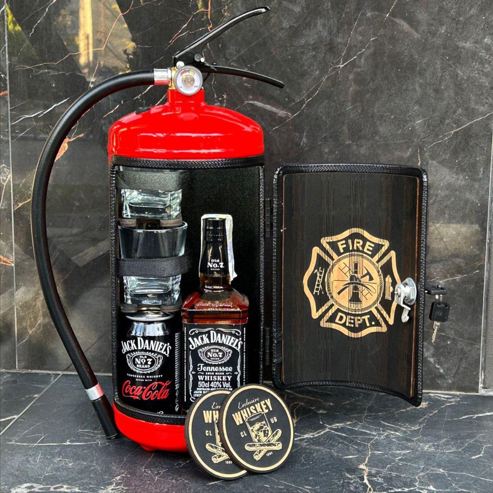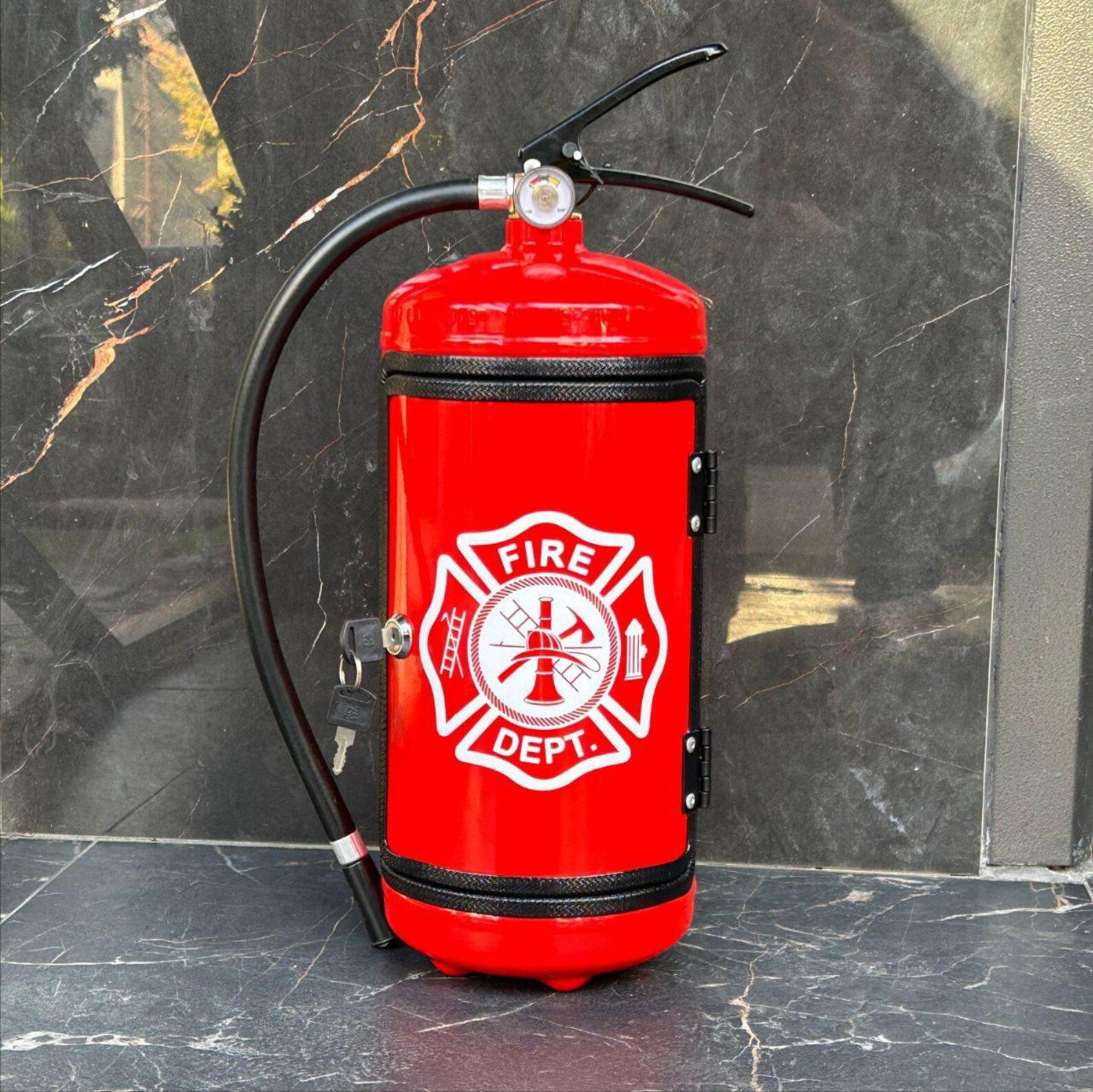 هذا الميني بار مصنوع من طفاية حريق حقيقية. الطفاية مصنوعة من معدن متين. أثناء الإنتاج، يحول حرفيونا، بخبرتهم، طفاية الحريق إلى ميني بار لمشروبك المفضل🥃. يمكنك استخدام هذا الميني بار لتزيين منزلك🏠 أو اصطحابه معك في رحلة أو نزهة🧺 مع الأصدقاء. كما أنه خيار رائع كهدية مميزة 🎁.