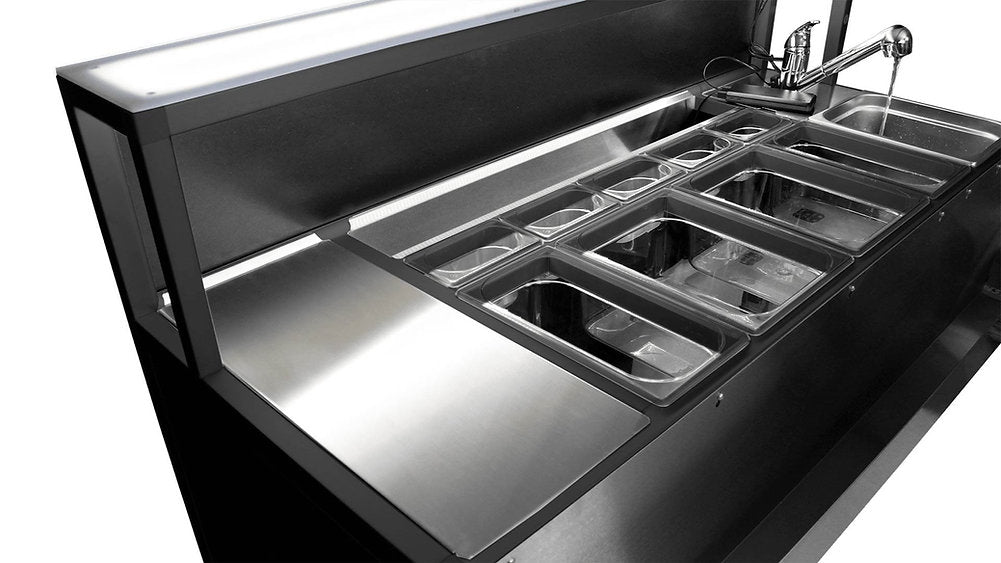 The LED-lit service counter enhances the presentation of your cocktails, making them even more appealing. Darkness is no longer an issue, and electricity won’t be either: the portable battery allows up to 8 hours of full-bright operation.
